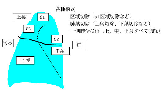 癌の根治を目指した標準術式は、肺葉切除と縦隔リンパ節郭清術です。しかし、近年、肺癌検診の普及、診断技術の向上により小さな肺癌が多く見つかるようになり、この中で腫瘍径が2cm以下、リンパ節転移なしの早期肺癌に対して根治性を目指した積極的縮小手術としての区域切除が実施されるようになってきました。そして、その手術成績は標準術式である肺葉切除と比較して遜色ない結果が報告されました。一方、低侵襲手術として胸腔鏡下肺葉切除術の普及も著しいものがあります。しかし、この方法は胸壁への侵襲は多少軽度ですが、肺の切除容量は区域切除に比べて大きいものです。胸腔鏡を併用した小開胸での区域切除が理想的です。開胸手術も低侵襲化への工夫がされており、胸壁の筋肉(広背筋や前鋸筋)を切断しない、側方切開、腋窩前方切開などの筋肉温存小開胸法が用いられています。進行度に合わせた、安全で根治性を担保できる術式の選択が大切です。